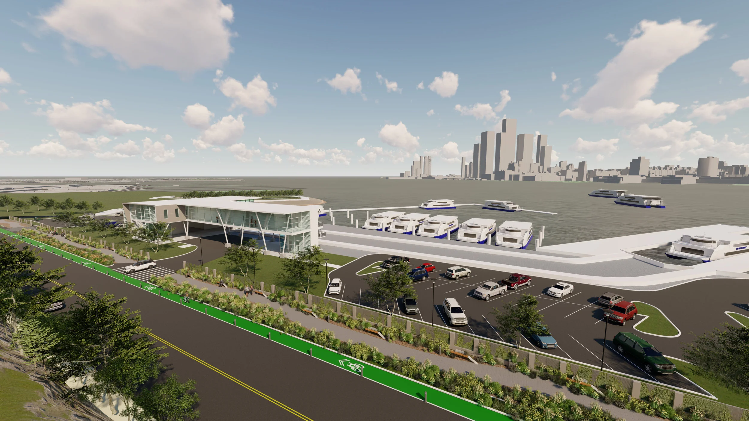 Working together with the New York Waterway company, our team has designed a brand new, 2-story ferry terminal that will operate as a maintenance and command center for the company to provide service to its millions of customers who rely on New York Waterway for their commute every day. The state-of-the-art facility will feature a public walkway on the street side of the property, offering public bike paths, seating, and unobstructed views of the skyline by raising the second level of the facility up a story in order to preserve public sightlines. The walkway also has a lower screen that will blur the views of maintenance operations while also providing privacy for our client without giving up public views of the Hudson. The walkway culminates with a fishing pier at the north end of the property, further enforcing our design concept of meeting our client’s needs while keeping the interests of the public in mind too, especially with such a visible site.